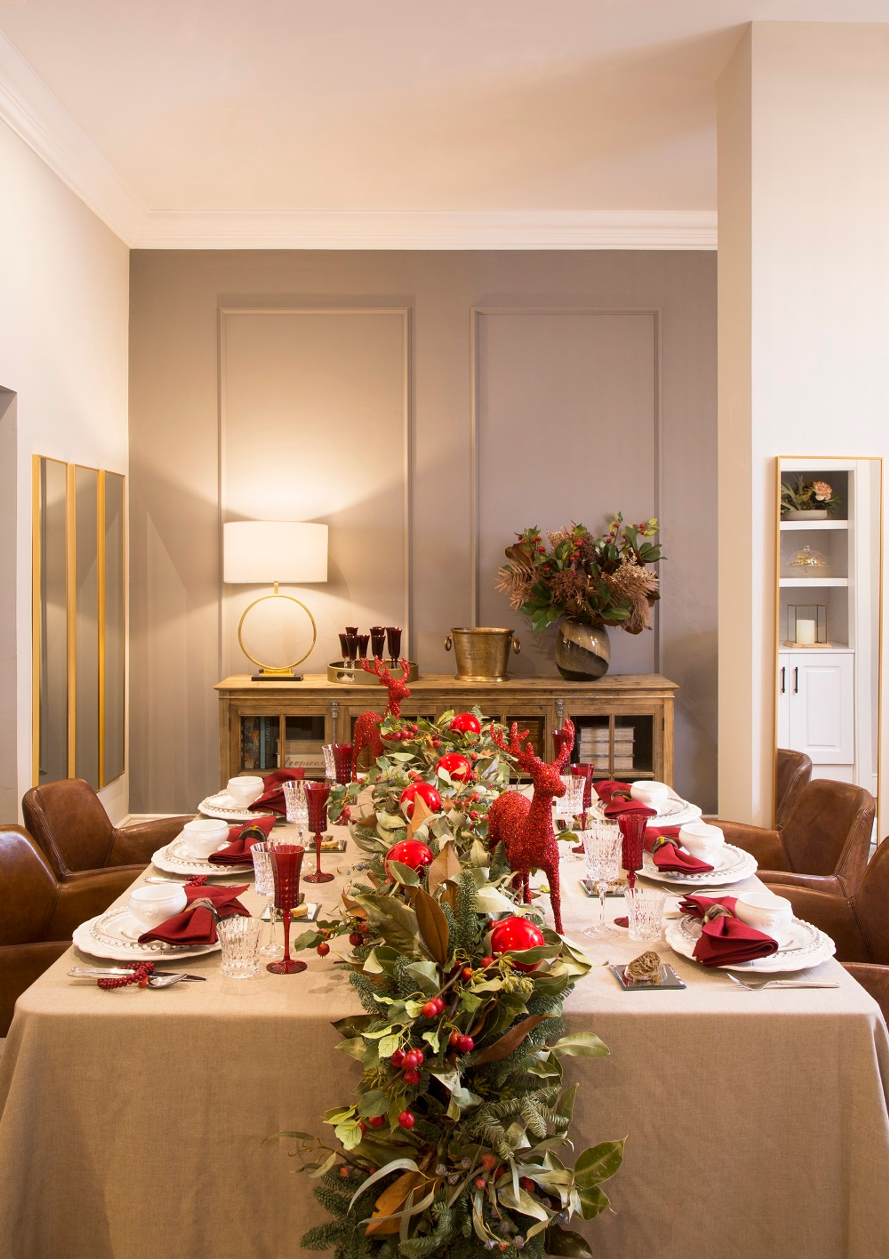 Capdevila has a fondness for eucalyptus and fir leaves because, “whether fresh or dried, they add a warm touch to the tables”, and from her experience, she notes: “I like to decorate the centers with garlands and wreaths of a wide variety of greens, with large leaves especially at the base of the centers. I also tend to give them personality with the occasional Christmas touch like red-painted leaves, ribbons, beads... “
